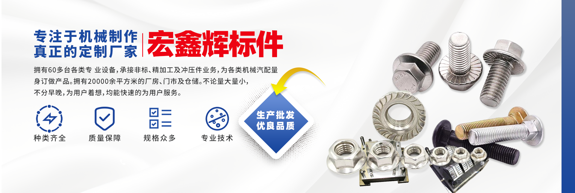 四川宏鑫輝標(biāo)準(zhǔn)件制造有限公司下設(shè):南充市宏輝機(jī)械制造有限公司,南充市聚宏機(jī)電設(shè)備有限公司,公司始建于1994年。為了拓展市場(chǎng),降低成本,本公司于2007年、2020年分別在南充、 成都、重慶創(chuàng)建了生產(chǎn)基地。擁有60多臺(tái)各類專 業(yè)設(shè)備,承接非標(biāo)、精加工及沖壓件業(yè)務(wù),為各 類機(jī)械汽配量身訂做產(chǎn)品。擁有20000余平方米的廠房、門市及倉儲(chǔ)。公司以誠信為本,竭誠為廣大客戶提供服務(wù)。不論量大量小,不分早晚,為用戶著想,均能快速的為用戶服務(wù)。 公司所生產(chǎn)及代理的產(chǎn)品為業(yè)界人士公認(rèn)的國內(nèi)、國際優(yōu)等品牌。在產(chǎn)品性能與質(zhì)量